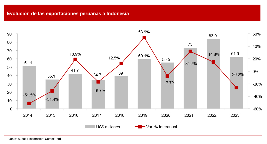 Se finalizó la negociación del Acuerdo de Asociación Económica Integral (CEPA, por sus siglas en inglés) con Indonesia, el undécimo socio comercial más importante del Perú dentro del APEC, según su valor exportado. Actualmente, Indonesia aplica tasas arancelarias más altas que las de Perú y aun así nuestras exportaciones crecieron, con un valor de US$ 536 millones entre 2014 y 2023. Este crecimiento se ha desacelerado en los últimos años y en 2023 registró una caída del 26.2%, por lo que la eliminación de estos aranceles abriría oportunidades para fortalecer y estabilizar el sector exportador peruano.