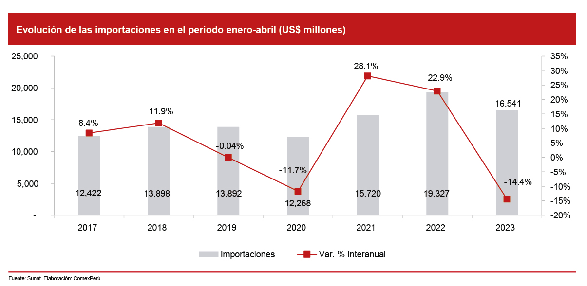 Si bien las importaciones peruanas cerraron el año 2022 con un crecimiento del 17.9%, en los primeros cuatro meses del presente año se evidenció una caída del 14.4% comparado con el mismo periodo del año anterior. De acuerdo con las cifras de la Sunat, las importaciones peruanas en el primer cuatrimestre del año sumaron US$ 16,541 millones, monto menor a los US$ 19,327 millones de 2022. Cabe mencionar que en todos los meses del período analizado se registraron caías con respecto a los mismos meses del año pasado: en enero, retrocedieron un 17.9%; en febrero, un 7.7%; en marzo, un 8.5%, y en abril, un 22.4%.
