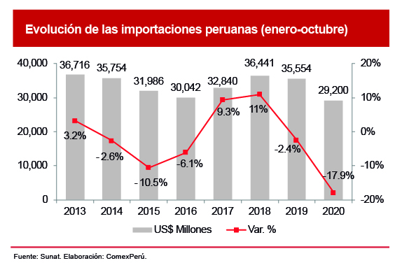 Aun visibilizándose las consecuencias de la COVID-19 en nuestra economía, las importaciones continuaron a la baja. De acuerdo con cifras de la Sunat, en el periodo enero-octubre de 2020, nuestras importaciones alcanzaron el valor de US$ 29,200 millones, un 17.9% menos que lo registrado en el mismo periodo de 2019. Solo en octubre, sumaron US$ 3,404 millones, un 11.4% menos que en octubre de 2019.