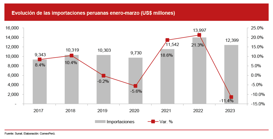 Al respecto, de acuerdo con cifras de la Sunat, para el periodo enero-marzo de este año, las importaciones peruanas registraron un valor de US$ 12,399 millones, lo que evidencia una caída del 11.4% con respecto al mismo periodo de 2022, cuando se importó un total de US$ 13,997 millones.