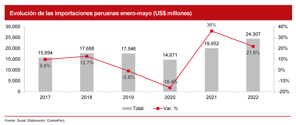 En el periodo enero-mayo de 2022, el valor de las importaciones ascendió a US$ 24,307 millones, un 21.6% más respecto del mismo periodo de 2021 (US$ 19,952 millones), según cifras de la Sunat. El monto importado en estos primeros cinco meses es el mayor en los últimos años e, incluso, supera los niveles de prepandemia, como en el caso de las importaciones en el mismo periodo de 2019 (US$ 14,671 millones).