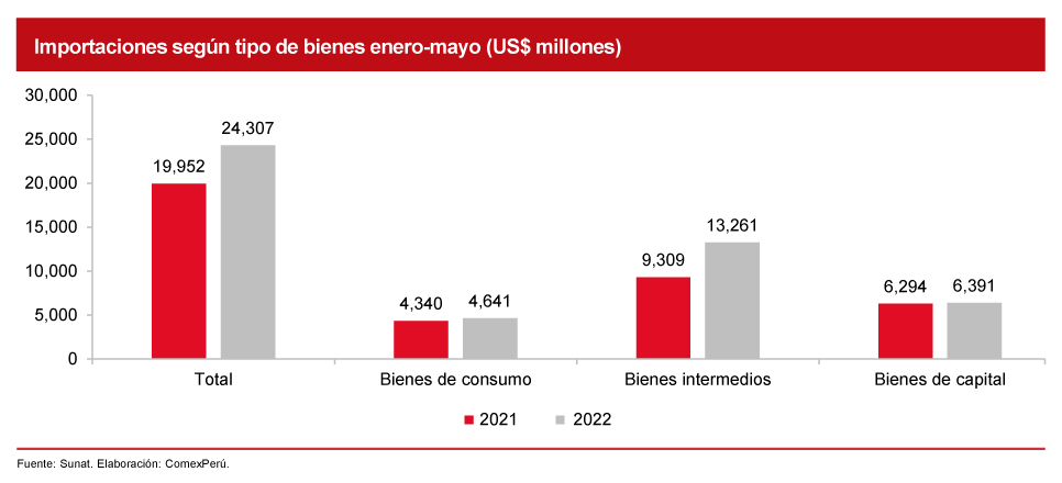 Con respecto a los bienes de consumo, en el periodo enero-mayo de 2022, las importaciones ascendieron a US$ 4,641 millones, un 6.9% por encima del mismo periodo del año previo (US$ 4,340 millones). En este rubro se registró un incremento del 14% en el valor de los bienes de consumo no duraderos, mientras que se redujo el monto de las importaciones de bienes de consumo duraderos en un 2%.