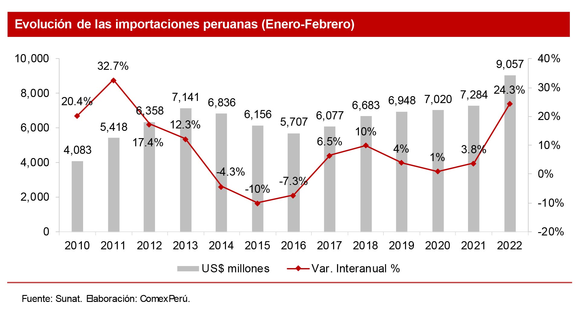 Las importaciones peruanas continúan su repunte pospandemia. Así lo demuestra el resultado de nuestras compras al exterior en el primer bimestre del año. De acuerdo con cifras de la Sunat, con un acumulado de US$ 9,057 millones entre enero y febrero de 2022, nuestras importaciones se incrementaron un 24.3% respecto del mismo periodo de 2021, con lo que registraron un récord histórico.