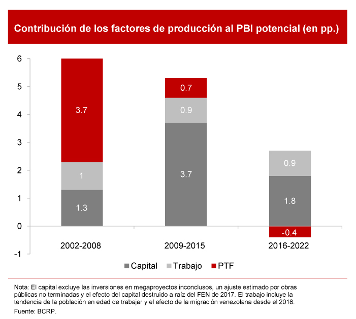 El crecimiento económico está estrechamente ligado al crecimiento de la productividad total de los factores (PTF). El crecimiento del PBI potencial depende de la acumulación de factores productivos y su productividad, de acuerdo con el Banco Central de Reserva del Perú. La acumulación de factores, como el trabajo y el capital, está impulsada por la inversión y el crecimiento de la población en edad de trabajar. Así, la productividad refleja la capacidad de producir más con los factores acumulados y está determinada por la eficiencia en la combinación de trabajo y capital, influida por la tecnología, las regulaciones y las instituciones.