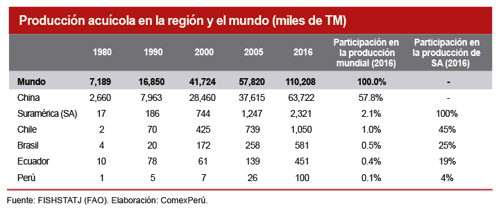 Según cifras de la FAO, en 2016, la acuicultura en el territorio peruano produjo 100,000 TM, lo que representó un 4% de la producción de SA y un 10% de la producción de Chile. En nuestro país, la producción acuícola se concentra en langostinos, conchas de abanico y trucha, que representan el 95% de la producción nacional del sector. Las dos primeras son extraídas en agua salada (acuicultura marina), desarrolladas principalmente en Piura y Tumbes, y su destino es principalmente el exterior, mientras que la producción de trucha es de origen andino y su consumo es interno, según el Ministerio de la Producción.