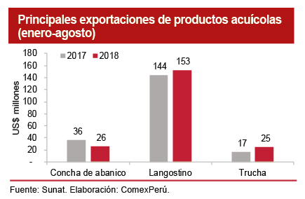 En lo que respecta a nuestros envíos de productos acuícolas al exterior (considerando langostinos, conchas de abanico y truchas), según cifras de la Sunat, en el periodo enero-agosto de 2018, estos alcanzaron un valor de US$ 203 millones, lo que refleja un incremento del 3% con respecto al mismo periodo de 2017. Dicho dinamismo se explicó por el aumento de las exportaciones de langostinos, que pasaron de US$ 143.8 millones, en el periodo enero-agosto de 2017, a US$ 152.5 millones, en el mismo periodo de 2018 (+6%), y de nuestros envíos de truchas, que pasaron de US$ 16.7 millones a US$ 24.7 millones (+48%) en el periodo analizado. Esto contrarrestó la caída de nuestras exportaciones de conchas de abanico, que se redujeron un 29.4%.