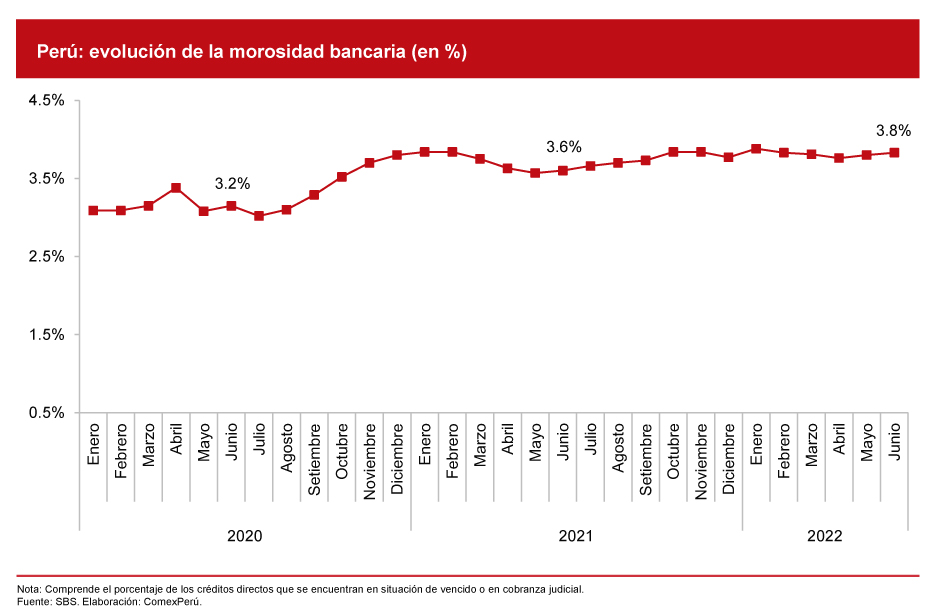 Por otro lado, la morosidad bancaria (porcentaje de los créditos directos que se encuentran en situación de vencido o en cobranza judicial) fue del 3.8% en junio de 2022, 0.23 pp. más que lo registrado en el mismo mes de 2021.