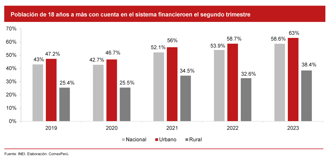 Al respecto, de acuerdo con el último informe del Instituto Nacional de Estadística e Informática (INEI), la inclusión financiera ha mostrado mejoras notables en nuestro país al segundo trimestre de 2023. Por ejemplo, el 58.6% de la población mayor de edad tiene una cuenta en el sistema financiero, cifra que refleja un aumento de 4.7 puntos porcentuales (pp) con respecto al mismo periodo de 2022 y de 15.6 pp en comparación con el mismo periodo de 2019. Cabe mencionar que, a nivel de zonas urbana y rural, los incrementos pospandemia fueron de 15.8 pp y 13 pp, respectivamente.