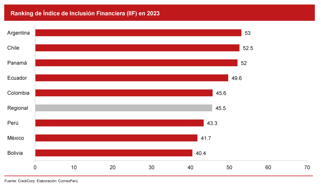 A todo ello debemos sumarle muchas barreras en el acceso a productos financieros, como un bajo nivel de educación financiera, la ausencia de servicios tecnológicos y de telecomunicaciones de calidad en varias regiones del país, y la poca adecuación a las necesidades de los consumidores (ver semanarios 1127 y 1094). Estos problemas, hoy en día, afectan más que nada a la población de menores recursos económicos, quienes justamente se beneficiarían más si participaran de forma más activa en el sistema financiero. La combinación de estos y otros factores hace que, pese a los avances experimentados luego de 2019, el Perú se ubique solo por encima de México y Bolivia en el ranking de Credicorp.