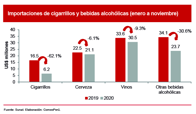 En particular, esto se puede apreciar en la evolución de las importaciones de productos como los cigarrillos, que apenas alcanzaron un valor de US$ 6.2 millones el año pasado, una disminución del 62.1% con respecto al mismo periodo de 2019. Esto también sucedió con las bebidas alcohólicas, pues las importaciones de cervezas sumaron US$ 21.1 millones (-6.1%); de vinos, US$ 30.5 millones (-9.3%), y del resto, US$ 23.7 millones (-30.6%). Esta situación, sumada a la paralización de la producción interna, cuya reactivación recién se permitió durante la segunda fase, se reflejó en una escasez de estos productos en el país, pero ello no implicaría un aumento verdadero ni permanente de los precios.