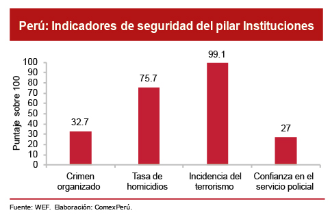 En la edición anterior, desarrollamos de manera general los resultados del Índice de Competitividad Global 2018, elaborado por el Foro Económico Mundial (WEF, por sus siglas en inglés), y expusimos los aspectos buenos, regulares y malos de nuestra economía, de acuerdo con los 12 pilares evaluados por el WEF. Debido a la importancia de este índice como herramienta de análisis comparativo de los distintos factores que influyen en la competitividad de las economías en el mundo, consideramos oportuno desarrollar a profundidad cada uno de sus 12 pilares, así como sus respectivos indicadores, para entender cuáles son nuestras mayores debilidades, comprender cómo otras economías están enfrentando las suyas y de qué manera sus esfuerzos pueden resultarnos útiles. A continuación, iniciaremos con el pilar 1, referido a Instituciones, que en total agrupa 20 indicadores. En este primer análisis, consideraremos los primeros cuatro, relacionados a cuestiones de seguridad: (i) costos que genera el crimen organizado, (ii) tasa de homicidios, (iii) incidencia del terrorismo y (iv) confianza en el servicio policial.