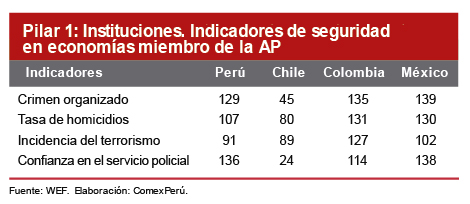 De manera general, en lo que respecta al pilar Instituciones, nuestra economía se ubicó en el puesto 90 de un total de 140. Nueva Zelanda lidera el ranking, seguido por Finlandia y Singapur. En la región, las economías mejor ubicadas son Chile y Uruguay, en los puestos 32 y 34, respectivamente. Más atrás se encuentran las demás economías miembro de la Alianza del Pacifico (AP): Colombia (89) y México (105).