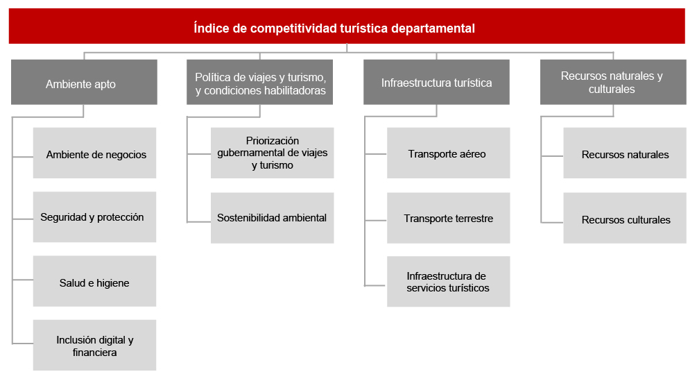El pilar Infraestructura turística cuantifica la disponibilidad y la calidad del capital físico que habilita este tipo de actividad en los departamentos del país. Incluye 3 indicadores: (i) transporte aéreo, (ii) transporte terrestre e (iii) infraestructura de servicios turísticos. En conjunto, estos indicadores permiten una mejor conectividad entre los atractivos turísticos de los departamentos, además de ofrecer un servicio de mejor calidad a los turistas que visitan las diferentes zonas del país, lo que eleva la competitividad del departamento y, consecuentemente, permite mayores beneficios derivados del turismo para la economía local.