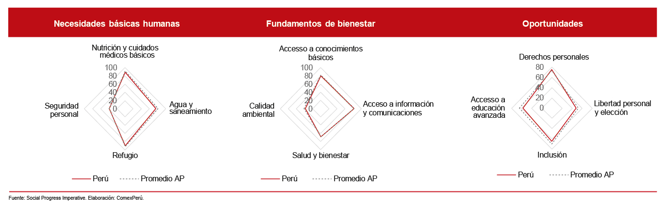 En términos relativos, el Perú se ubica en una peor posición respecto a los países de la AP en lo relacionado con temas de libertad personal y de elección, agua y saneamiento, y acceso a educación superior. En este último punto, nuestro país se ubica en un nivel menor al promedio mundial.