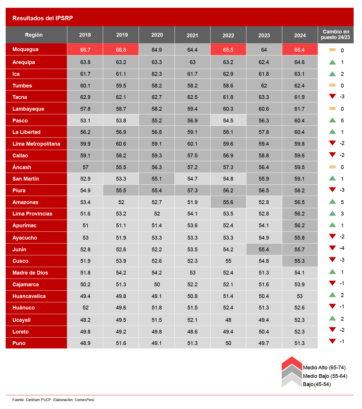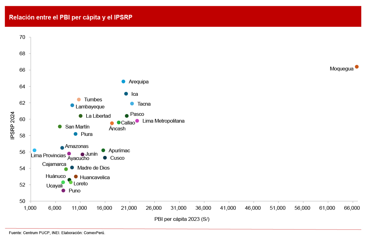 El Índice de Progreso Social Regional del Perú (IPSRP) analiza las dimensiones sociales no económicas de las regiones. Moquegua encabeza el ranking. En contraste, otras regiones como Loreto y Puno enfrentan desafíos por la elevada informalidad y las limitaciones en el acceso a servicios esenciales. Este índice orienta a los responsables de políticas públicas a conocer qué brechas reducir para mejorar la calidad de vida de los ciudadanos.