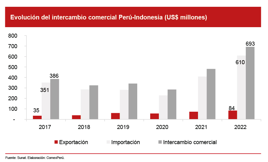 Con respecto al intercambio comercial entre el Perú e Indonesia, este sumó un valor de US$ 693 millones en 2022, con un crecimiento del 44% respecto del año anterior. Por su parte, la balanza comercial fue negativa en US$ 526 millones en 2022, pues las importaciones (US$ 610 millones) superaron a las exportaciones (US$ 84 millones).