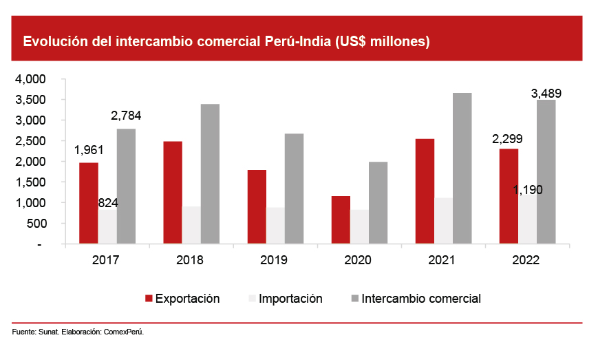Entretanto, el intercambio comercial entre el Perú y la India alcanzó un valor de US$ 3,489 millones en 2022, lo que representó una caída del 4.6% con respecto a 2021. Por otro lado, la balanza comercial fue positiva en US$ 1,109 millones en 2022, pues las exportaciones (US$ 2,299 millones) fueron mayores que las importaciones (US$ 1,190 millones) en ese periodo.