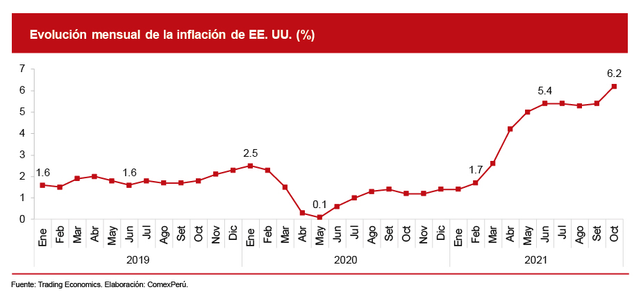 Después de cierta estabilidad en los meses previos, en octubre del 2021, la inflación de Estados Unidos (EE. UU.) se elevó al 6.2%, cifra no vista desde hace 30 años. Como se observa en el gráfico, la inflación estadounidense registró una tendencia al alza, después de mayo de 2020, cuando alcanzó un valor mínimo del 0.1%.
