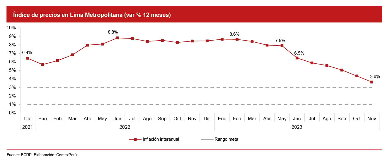 Según el último Reporte de Inflación del Banco Central de Reserva del Perú (BCRP), la inflación interanual disminuyó constantemente desde febrero, momento en el que se situó en un 8.7%, hasta noviembre, cuando alcanzó un 3.6%. Aunque esta disminución es significativa, la tasa de inflación aún se mantiene fuera del rango meta (1%-3%).