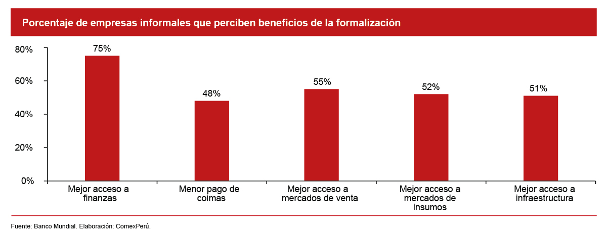 Recientemente, el director de indicadores globales del Banco Mundial, Norman Loayza, adelantó hallazgos sobre una nueva investigación de la percepción de los beneficios de formalizarse, desde la visión de las propias empresas informales[1]. Los resultados arrojan que el 75% de los negocios encuestados reconocen el mejor acceso a financiamiento como el mayor beneficio de pasar a la formalidad. A pesar de esto, este porcentaje cae a cerca del 50% para otras nociones importantes, como el reducir pérdidas por coimas o el acceder a mejores canales de venta, insumos e infraestructura. Adicionalmente, el estudio provee información adicional sobre cómo las empresas más nuevas, con mayor capital físico, con propietarios que alcanzaron un mayor nivel educativo y que hayan experimentado alguna dificultad relacionada con los indicadores mencionados perciben mayores beneficios de convertirse en formales.