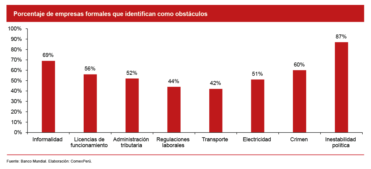 Otro aspecto por resaltar es que, cuando se considera la percepción de los principales obstáculos para ser formales por parte de empresas registradas ante la Sunat, destaca que el 87% de ellas indicaron la inestabilidad política como la principal barrera. La segunda principal limitación sería la informalidad (69% de las empresas encuestadas), porque las formales deben competir contra aquellas que no pagan impuestos ni cumplen con los requerimientos que implica formalizarse. Otras limitaciones residen en el riesgo por crimen e inseguridad ciudadana (60%) y en las dificultades para acceder a las licencias de funcionamiento (56%). Es importante destacar que esta última limitación, junto con la administración tributaria, son aspectos que pueden mejorarse con óptimos servicios de atención y simplificación de los procesos.