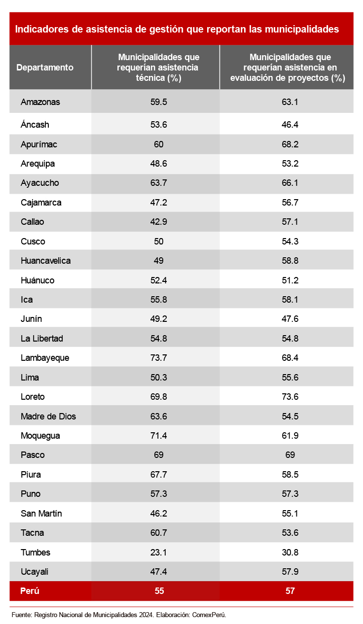 Dado que la mayoría de las obras paralizadas se concentran en los Gobiernos locales, cabe preguntarse qué ocurre a nivel municipal. Los datos del Registro Nacional de Municipalidades 2024 (RENAMU), elaborado por el Instituto Nacional de Estadística (INEI), evidencian serias deficiencias en la planificación y las capacidades técnicas de dichas instituciones. Las principales causas están estrechamente relacionadas con las limitaciones técnicas y presupuestarias que enfrentan los Gobiernos locales. A nivel nacional, el 55% de las municipalidades informó que necesitaba asistencia técnica, mientras que el 57% requería apoyo en la evaluación de proyectos. Esta carencia de apoyo contribuye de manera directa al elevado número de obras paralizadas y a las fallas encontradas en contratos y expedientes técnicos.