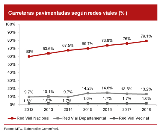 En nuestro país, el sistema vial está estructurado en tres niveles: la Red Vial Nacional (27,109 km), competencia del Ministerio de Transportes y Comunicaciones (MTC); la Red Vial Departamental (27,505 km), responsabilidad de los Gobiernos regionales, y la Red Vial Vecinal (113,857 km), competencia de los Gobiernos municipales. En cuanto a la primera, los avances en calidad de carreteras pavimentadas han sido notorios. Según cifras del MTC, el porcentaje de red vial nacional pavimentada pasó del 59.9% en 2012 al 79.1% en 2018. Sin embargo, la tendencia no es la misma en cuanto a la red departamental que, con un total de 3,623 km, alcanzó un 13.2% de vías pavimentadas en 2018.