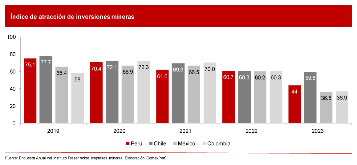 El salto positivo en el ranking se dio pese a que el país cayó 0.96 puntos en el índice de atracción de inversiones mineras. Al evaluar los resultados históricos, se observa que el Perú perdió competitividad con el paso de los años. El resultado de la última edición se debió a la preocupación por la mano de obra en el país, el régimen fiscal y la incertidumbre en torno al reclamo de tierras en litigio. Además, todos los encuestados expresaron su preocupación por la estabilidad política en el país, según el Instituto Fraser.