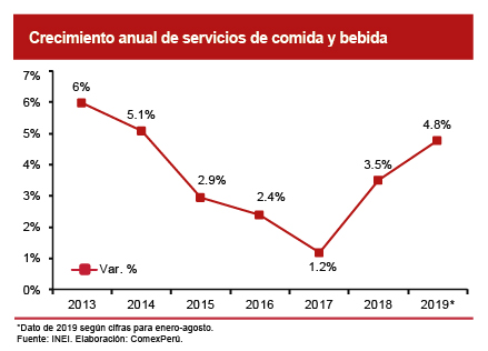 En el mes de agosto, los servicios de alojamiento y restaurantes crecieron un 6.1%, con lo que acumularon un dinamismo del 4.4% entre enero y dicho mes, de acuerdo con cifras del Instituto Nacional de Estadística e Informática (INEI). Así, el dinamismo de este sector viene contribuyendo positivamente a la tasa de crecimiento mensual del PBI en lo que va del año, con un aporte promedio de 0.14 puntos porcentuales (pp) por mes, lo cual es relevante si se considera que este año el Perú ha experimentado una desaceleración económica, siendo abril el mes de peor desempeño (solo 0.02 pp).