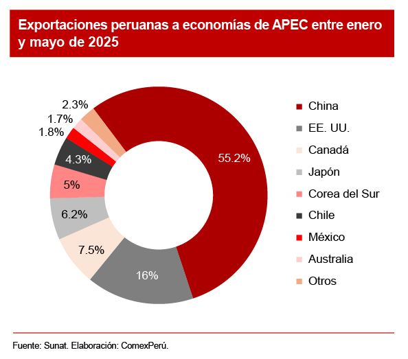 China se consolidó como el principal destino de las exportaciones peruanas al APEC, con envíos por US$ 12,352 millones (55.2% del total), lo que reflejó un incremento del 31.2%. EE. UU. (+19.5%), Canadá (+13%), Japón (-3.1%) y Corea del Sur (+11.7%) completaron el top cinco de principales destinos.