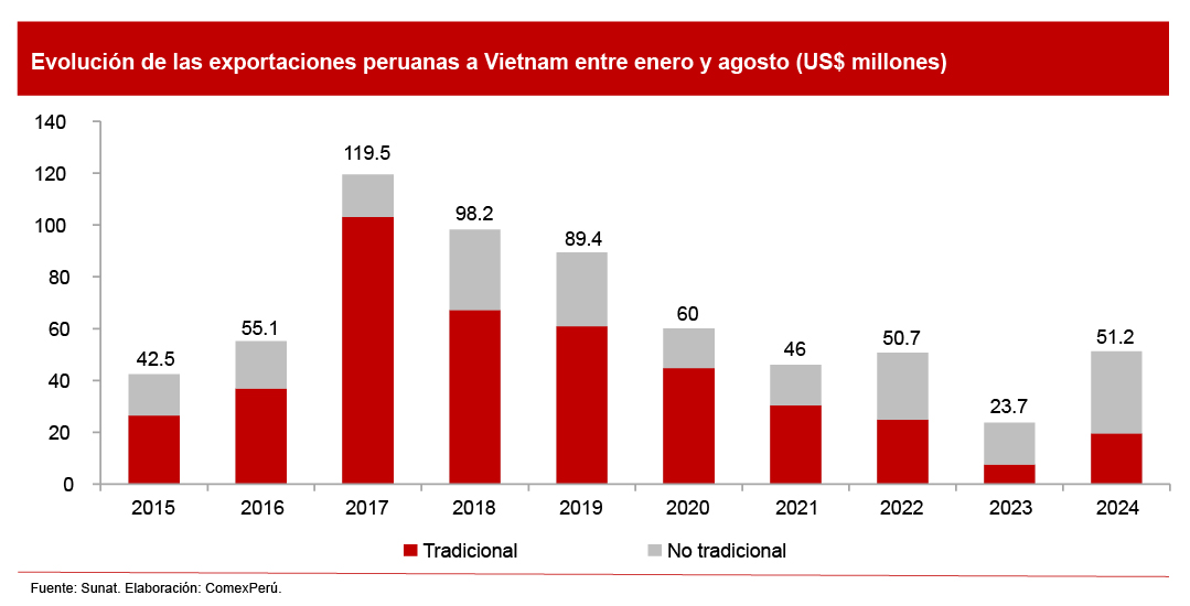 Las exportaciones no tradicionales representaron el 62% del total de envíos a Vietnam. Estos sumaron US$ 31.6 millones a agosto de 2024, lo que evidenció un crecimiento del 97% con respecto al mismo periodo del año anterior. Esta cifra supera en US$ 5.8 millones el valor exportado en 2022 (US$ 25.7 millones).