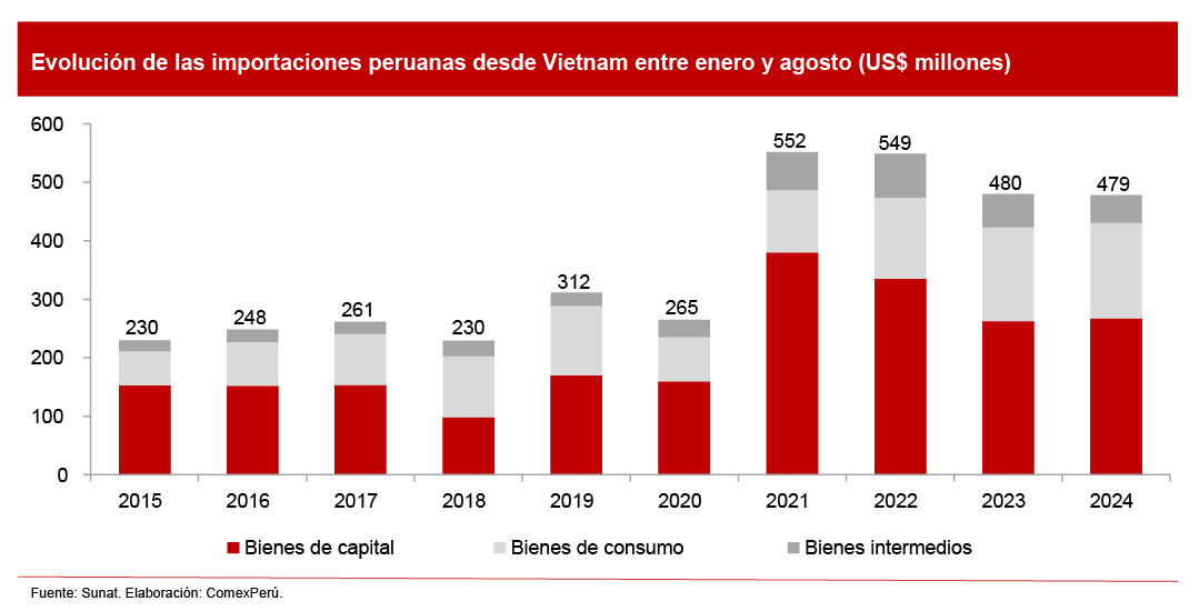Con respecto a nuestras importaciones procedentes de Vietnam, estas sumaron US$ 479 millones en los primeros ocho meses de 2024, lo que reflejó una ligera caída del 0.4% interanual. Entre los rubros importados destacaron los bienes de capital, que representan el 56% del total importado de dicho país, seguidos por los bienes de consumo e intermedios, con un 34% y 10%, respectivamente.