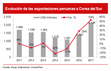 De acuerdo con cifras de la Sunat, en el periodo 2011-2017, las exportaciones peruanas a este país crecieron a una tasa promedio anual del 4%, ya que pasaron de US$ 1,696 millones en 2011 a US$ 2,136 millones en el último año. De ese monto, US$ 1,939 millones correspondieron a envíos del rubro tradicional (91% del total) y US$ 197 millones, al rubro no tradicional (9%). Según sostiene Joan Barrena, consejero de la Oficina Comercial de Perú en Seúl, respecto de los productos no tradicionales, el valor positivo de exportación sería el reflejo de la gran cantidad de empresas que han ingresado a exportar productos como castañas, cacao, sacha inchi y langostinos frescos. Cabe resaltar que el monto exportado en 2017 fue un 53% mayor al de 2016, con lo que se alcanzó un récord histórico.