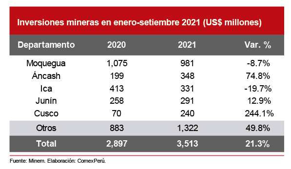 Con relación a la inversión minera, según el último boletín minero del Ministerio de Energía y Minas (Minem), en el periodo enero-setiembre de 2021, alcanzó un valor de US$ 3,513 millones y creció un 21.3% con relación a los US$ 2,897 millones invertidos en el mismo periodo de 2020. En lo que respecta a los departamentos que más se beneficiaron con las inversiones en el sector, lideran la lista Moquegua, con US$ 981 millones (-8.7% respecto del mismo periodo del año anterior); Áncash, con US$ 348 millones (+74.8%); e Ica, con US$ 331 millones (-19.7%).
