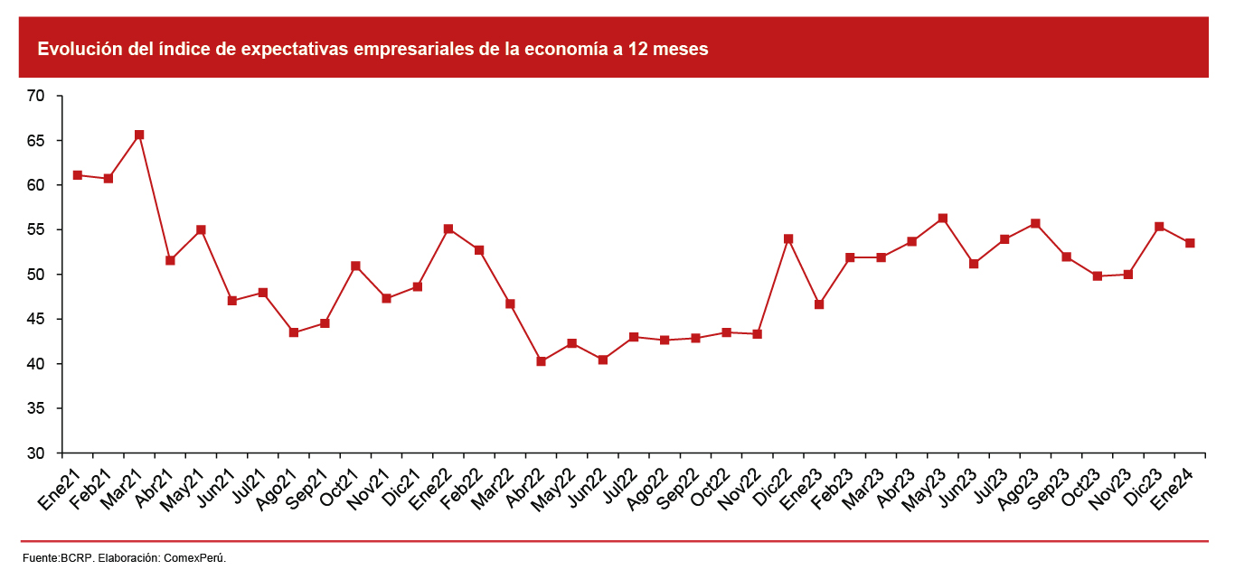 Según el BCRP, el desempeño de la inversión privada estuvo marcado por el deterioro de la confianza empresarial y la disminución de la inversión residencial. No obstante, la confianza empresarial empezaría a recuperarse bajo un entorno de estabilidad social y política, y la reversión de los fuertes choques de oferta. Asimismo, el acceso al crédito se vería impulsado por la mejora de las condiciones financieras locales y globales. Estos factores permitirían que la inversión privada revierta su caída, por lo que el BCRP revisó sus estimaciones de crecimiento al 1.8% y el 3% para 2024 y 2025, respectivamente. De igual manera, se pueden apreciar indicios de recuperación en el índice de expectativas empresariales de la economía a 12 meses, que se situó por encima de los niveles registrados en 2022.