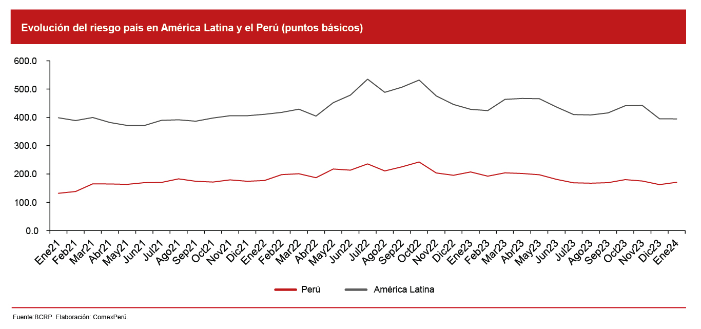 Por otro lado, el BCRP advierte que el aumento de la volatilidad en los mercados financieros internacionales podría provocar salidas de capitales en economías emergentes. Para el caso del Perú, a esto se le sumarían los riesgos por la incertidumbre política y la conflictividad social. Estos factores podrían ejercer presiones al alza en el tipo de cambio, lo que contribuye a un aumento de la inflación. A pesar de ello, se ha revisado la estimación de este riesgo en comparación con lo informado en el reporte anterior, y se observa una tendencia a la baja en el Diferencial de Rendimientos del Índice de Bonos de Mercados Emergentes (EMBIG, por sus siglas en inglés) del Perú, que a enero de 2024 registró una disminución del 29.7%, en comparación con el último pico en octubre de 2022.