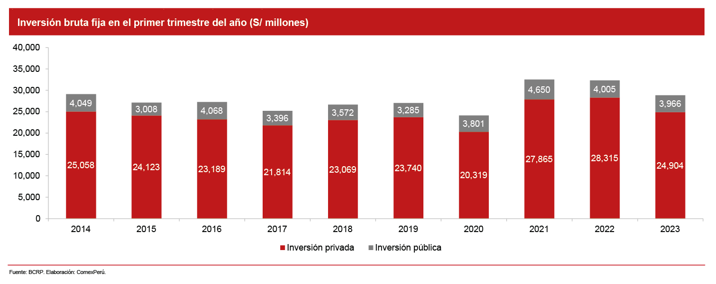 De acuerdo con cifras del Banco Central de Reserva del Perú (BCRP), durante el primer trimestre de 2023, la inversión bruta fija a nivel nacional sumó un total de S/ 28,870 millones a precios constantes desde 2007 (-10.7% con respecto a similar período de 2022). Gran parte de ella estuvo compuesta por la inversión privada, la cual contribuyó con S/ 24,904 millones (86.3% del total), lo que representó un 19% de la demanda interna. Por su parte, la inversión pública alcanzó S/ 3,966 millones (-1%), es decir, un 13.7% del total.