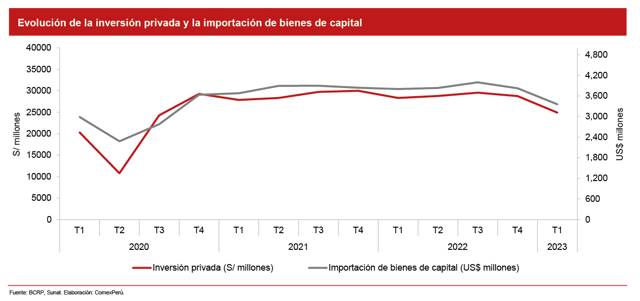 En el primer trimestre del año, las importaciones de bienes de capital sumaron S/ 3,356 millones, con una disminución del 11.7% en comparación con el mismo período de 2022, según cifras de la Sunat. De manera desagregada, los bienes de capital para la industria (US$ 2,158 millones, -11.1%), materiales de construcción (US$ 315 millones, -35.9%) y agricultura (US$ 38.2 millones, -21.9%) fueron los que generaron dicha reducción. Por su parte, el BCRP indica que la disminución del 6.3% de los bienes orientados a la inversión se debió a la contracción de cemento (-16.8%), productos minerales no metálicos diversos (-19.7%), productos metálicos (-11.4%), maquinaria eléctrica (-26.1%) y material de transporte (-12%).