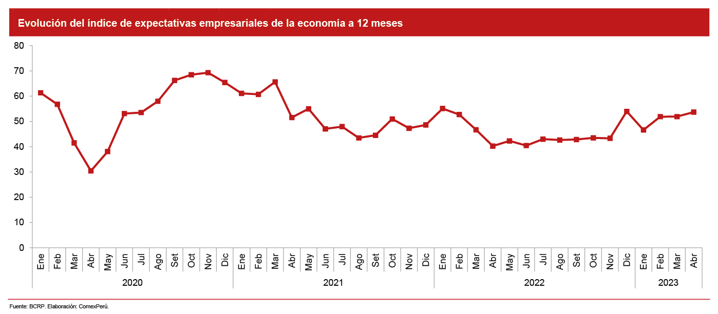 Ahora bien, de acuerdo con el INEI, el sector privado fue uno de los más afectados por los conflictos sociales en el sur del país, la inestabilidad política y los fenómenos climáticos en las regiones norte y centro del país, lo que ocasionó un ambiente de riesgo en nuestro país y, a su vez, una mayor desconfianza para las empresas nacionales y extranjeras. Por su parte, según el BCRP, el índice de expectativas de la economía a 12 meses se ubicó por debajo de los 50 puntos (terreno negativo) durante el primer mes de 2023.