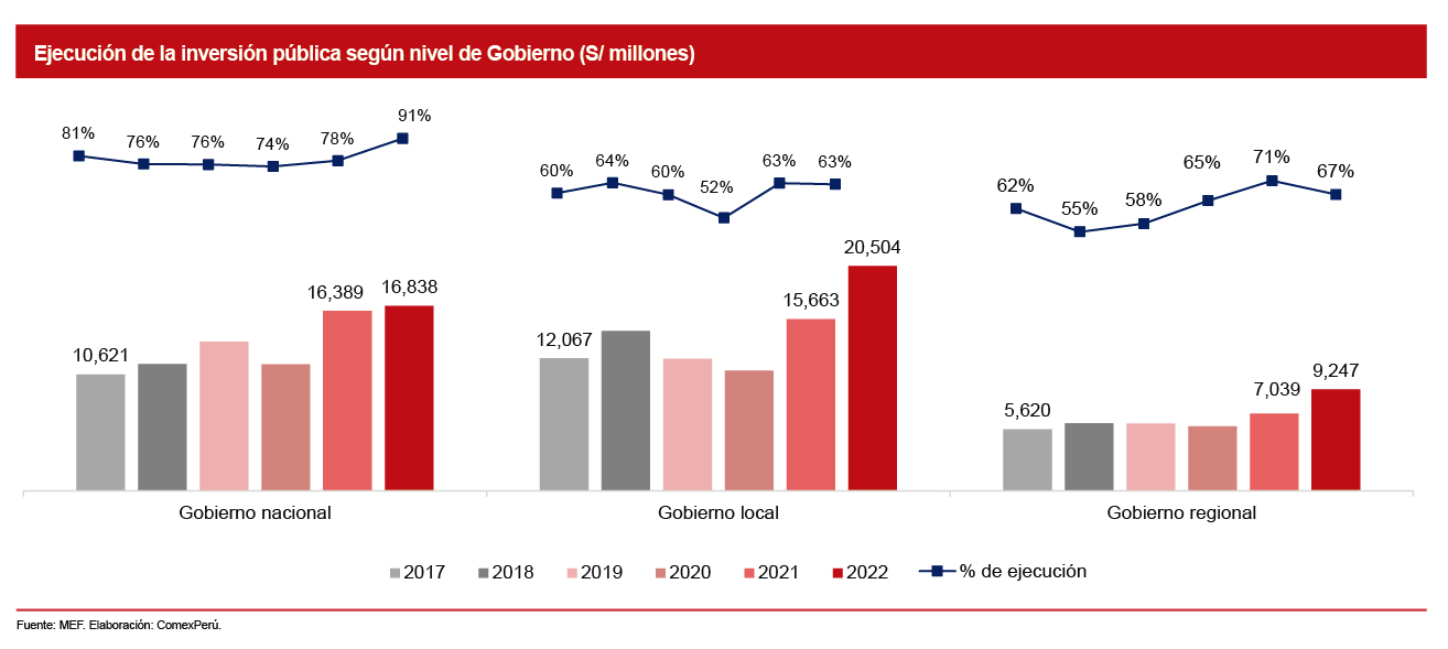 En 2022, la inversión pública marcó un récord histórico, con un total de S/ 46,589 millones. Esto es un 19% más que el valor en 2021 y representa el 72% del total presupuestado. Un aspecto por destacar es que fueron los Gobiernos locales quienes han gastado más; sin embargo, su porcentaje de ejecución sigue siendo el más bajo (63%). Ello demuestra, una vez más, que el problema muchas veces no es la falta de recursos, sino la falta de capacidades de gestión de las autoridades para hacer uso de ellos.