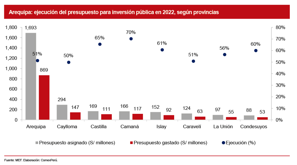 Asimismo, la provincia con mayor presupuesto asignado fue la de Arequipa, con un monto de S/ 1,693 millones, del cual solo se gastó el 51%. Cabe mencionar que las municipalidades con mayor presupuesto en esta provincia fueron Yarabamba (S/ 304 millones) y Cerro Colorado (S/ 198 millones). Estos grandes recursos se explican por lo recaudado de la actividad minera en el departamento. En concreto, el canon, el sobrecanon y las regalías financian el 81% de la inversión pública del Gobierno regional de Arequipa y el 91% de los Gobiernos locales.