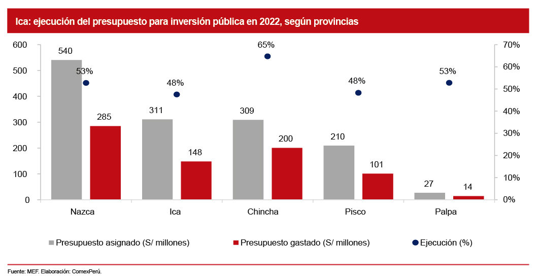 En detalle, la provincia que recibió mayor presupuesto fue Nazca (S/ 540 millones), aunque solo ejecutó el 53%, seguida por Ica, que recibió S/ 311 millones e invirtió el 48%. Al igual que en Arequipa, este departamento cuenta con ingentes recursos producto de la actividad minera. Así, 8 de cada 10 soles destinados a proyectos de inversión se cubren con lo recaudado por canon, sobrecanon y regalías.