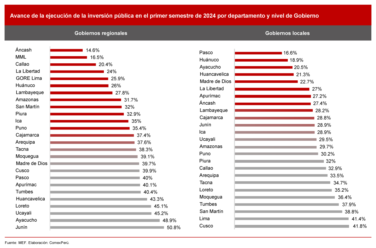 En el primer semestre del año, los Gobiernos regionales (GORE), en conjunto, han ejecutado el 35.7% del presupuesto asignado a inversión pública. Los GORE con peor desempeño son el Callao (20.4% de ejecución), la Municipalidad Metropolitana de Lima (16.5%) y Áncash (14.6%).