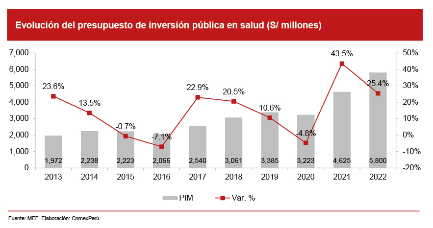 De acuerdo con cifras del Ministerio de Economía y Finanzas (MEF), en el período 2013-2022, el presupuesto institucional modificado (PIM) para los proyectos de inversión en salud pública, en los tres niveles de gobierno, pasó de S/ 1,972 millones a S/ 5,800 millones, lo que refleja un crecimiento promedio anual del 12.7% y un crecimiento acumulado del 194%. Cabe precisar que, durante dicho período, el PIM ha mostrado incrementos desde 2017, a excepción de 2020, y registró un mayor aumento en 2021 (+43.5%).