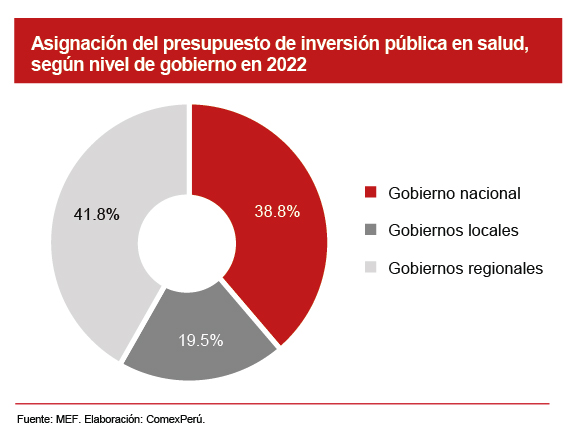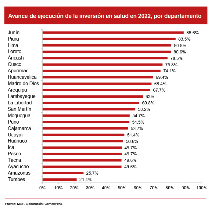 A nivel departamental, en 2022, Junín registró un monto presupuestal de proyectos de salud de S/ 212 millones y logró una ejecución del 88.6%. Le siguen los departamentos de Piura (S/ 900 millones; 83.5%), Lima (S/ 523 millones; 80.8%), Loreto (S/ 240 millones; 80.6%) y Áncash (S/ 330 millones; 78.5%). En cambio, los departamentos que no alcanzaron una ejecución del 50% fueron Ica (49.7%), Ayacucho (49.6%), Tacna (49.6%), Amazonas (25.7%) y Tumbes (21.4%), según el MEF.