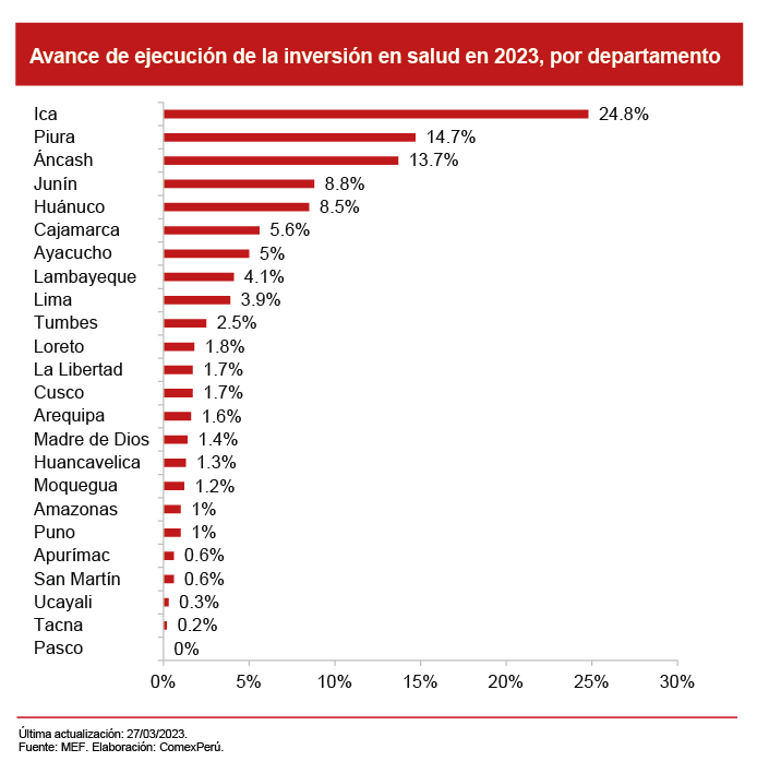 En cuanto a la inversión en salud de los principales departamentos con mayor ejecución, en lo que va de 2023, los proyectos relevantes fueron el fortalecimiento de la capacidad resolutiva de los servicios de salud del Hospital Regional de Ica (77.3%); la reconstrucción de los servicios del centro de salud Paccha, en el distrito de Chulucanas, en Piura (48.4%); la construcción y el mejoramiento de cementerios municipales, en Áncash (60.4%); el avance y la ampliación de los servicios de salud del establecimiento de salud Sánchez Meza, en Junín (75.5%); y la extensión del establecimiento de salud Llata, en Huánuco (53.4%).