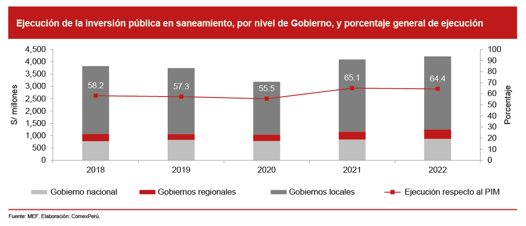 No obstante, es necesario mencionar que la ejecución de proyectos públicos de saneamiento, cuyo propósito precisamente es crear infraestructura de cobertura para estos servicios o mejorar la existente, es subóptima en general. De acuerdo con las cifras del Ministerio de Economía y Finanzas (MEF), la inversión pública en este sector, desde hace cinco años, oscila alrededor del 60% de ejecución de su presupuesto institucional modificado (PIM), lo cual sitúa a este sector usualmente entre los de menor porcentaje de ejecución del Gobierno (por ejemplo, en 2022, ocupó el cuarto peor lugar; en 2021, el noveno; y en 2020, el quinto).