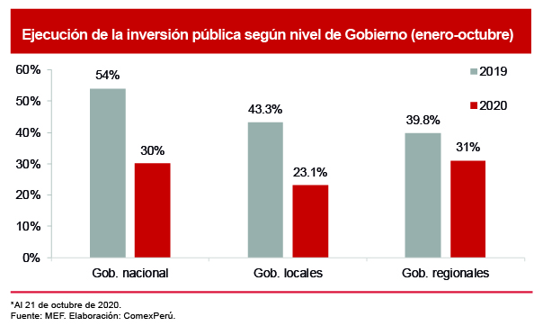 La inversión pública incide directamente en el cierre de brechas de acceso a servicios básicos como educación, salud, seguridad, entre otros, además de ampliar la capacidad productiva del país y generar condiciones óptimas para el desarrollo. Actualmente, se busca que esta sea el soporte de la contracción de la inversión privada y que contribuya a revertir la sustancial caída de la economía. De acuerdo con cifras del BCRP, se esperaría una caída de la inversión pública del 19% en 2020, con una recuperación del 11% el siguiente año, liderada por la ejecución de obras de reconstrucción, proyectos de infraestructura, reanudación de obras paralizadas, entre otros.