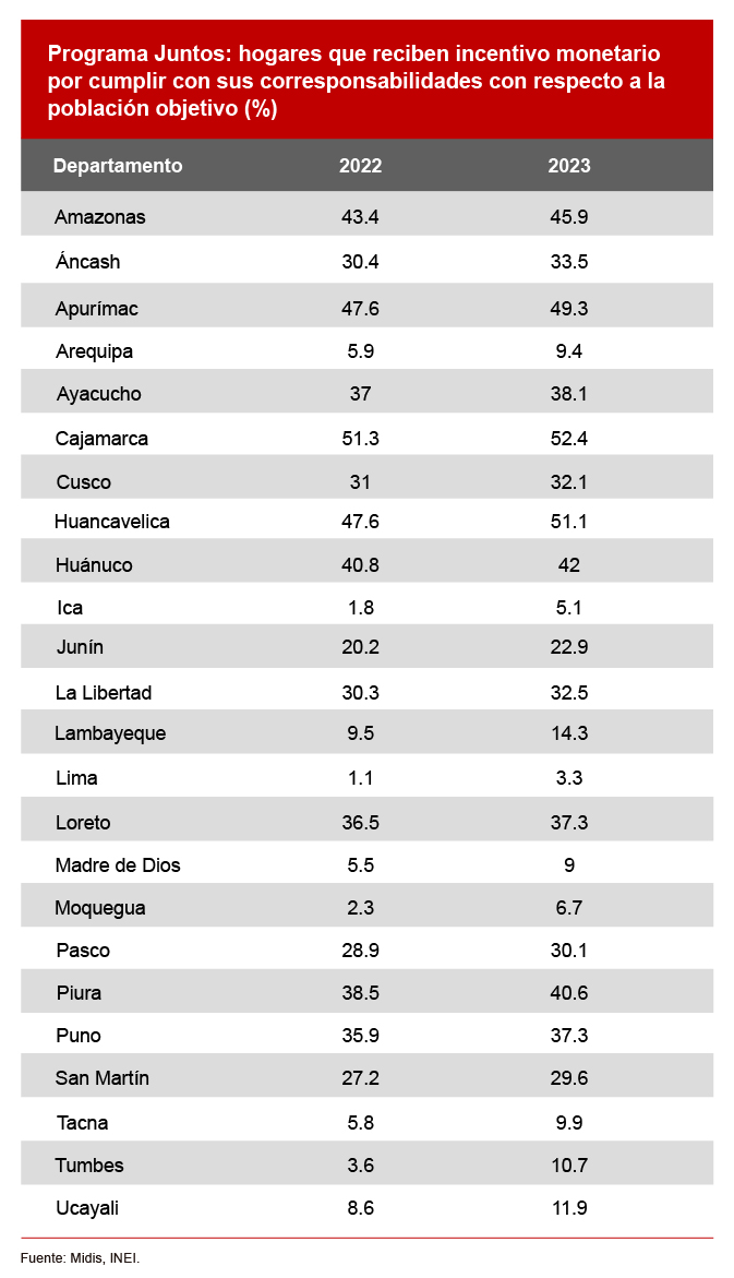 Luego de implementarse un rediseño en 2021, en el que se mejoraron los criterios de focalización, el programa Juntos alcanzó un 27.5% de su población objetivo en 2023, mientras que Cuna Más alcanzó un 21.5% y un 23.4% en la cobertura de su población objetivo que reciben los servicios de acompañamiento a familias y cuidado diurno, respectivamente.
