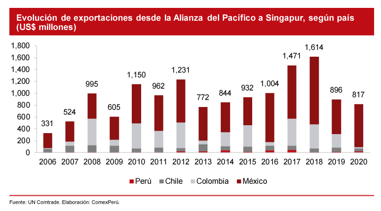 Al año 2020, según datos de las Naciones Unidas (UN Comtrade), el volumen de exportaciones totales desde los países miembros de la AP a Singapur sumó US$ 817.5 millones, monto que representó una caída del 8.8% con respecto a 2019, debido, en parte, a la pandemia de COVID-19. Dentro de la estructura de exportaciones, según países miembros de la AP, México es la economía con mayores valores de exportación a Singapur con US$ 582.2 millones en 2019, seguido de Colombia (US$ 229.7 millones), Chile (US$ 69.2 millones) y Perú (US$ 15 millones). Así, durante los últimos 10 años, México ha concentrado aproximadamente el 67% de las exportaciones totales, mientras que el Perú tan solo representa un 2%.